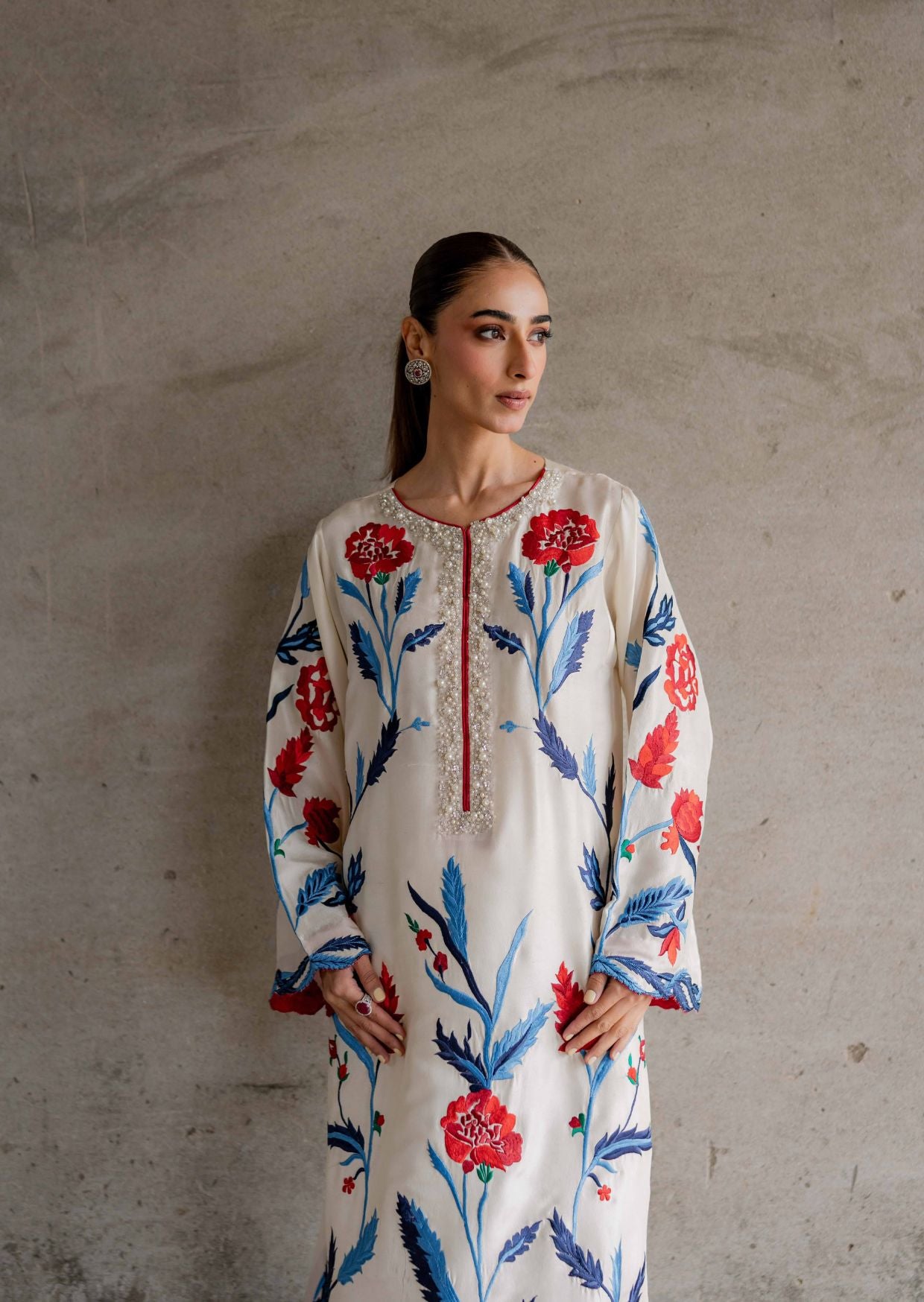 An ivory kaftaan brought to life with Iznik inspired artistry red and blue tones. The neckline is handcrafted with pearls, sequins and swaroskis. Tailored from pure 80-gm rawsilk, it offers a fluid drape and refined finish. Complimented by Korean raw silk pants, this ensemble is a heritage and timeless sophistication.